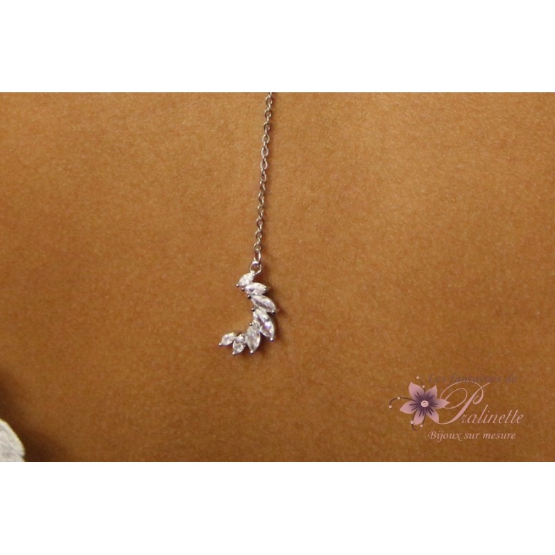 Bijou de dos mariage amovible sur fine chaîne argentée rhodiée et marquises serties strass oxyde de zirconium.