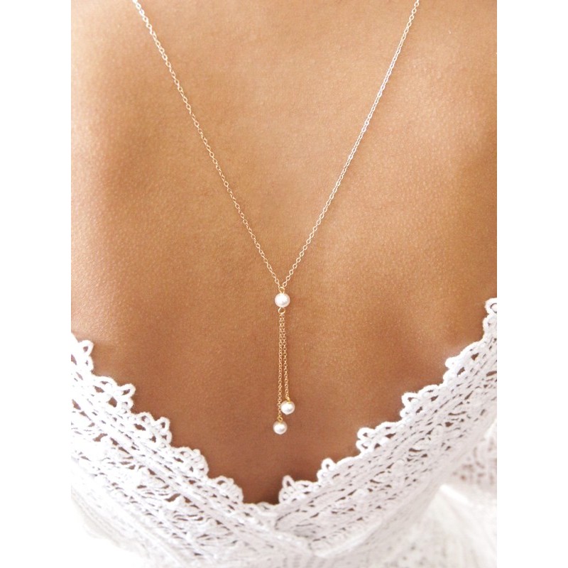 Sur le tour de cou, partie buste, on y retrouve une perle solitaire en cristal nacré, rappel de cette perle sur les pendants de dos.