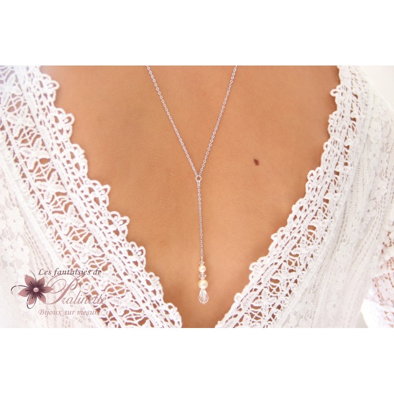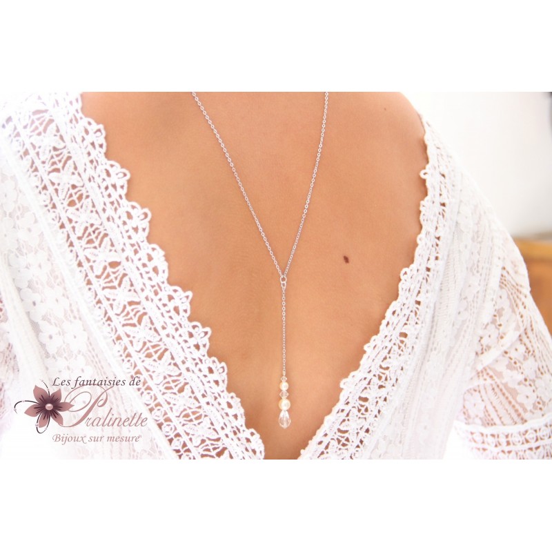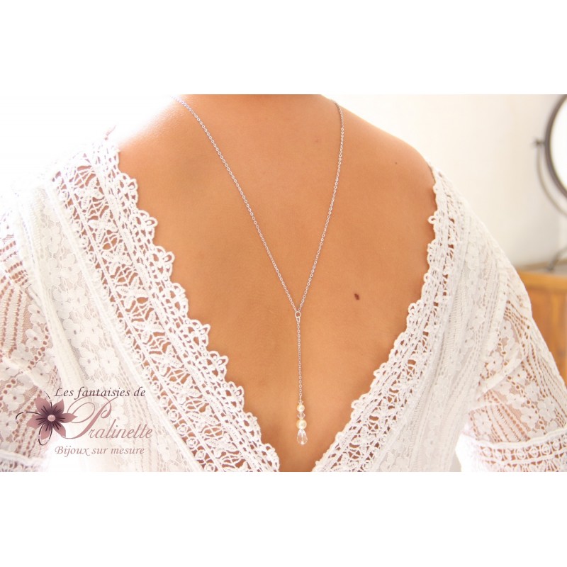 Collier bijou de mariage de dos et pendant en cristal. Confectionné avec une goutte en cristal, de perles en cristal et perles en cristal nacré.