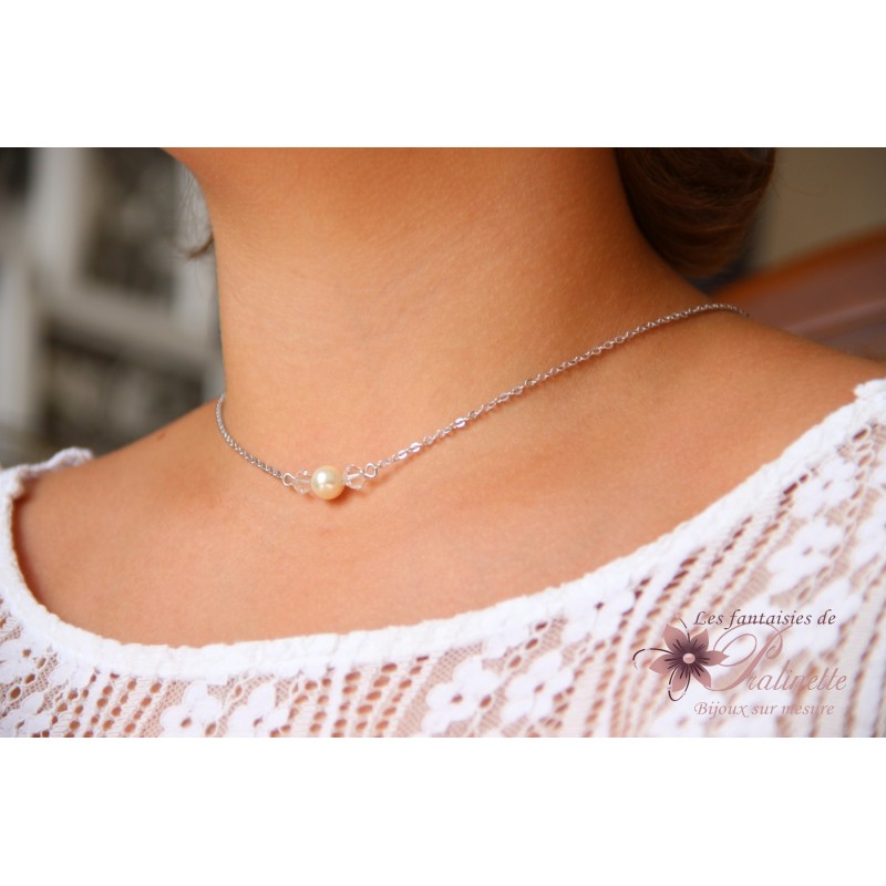 Le devant du collier comporte trois perles, une nacrée en cristal et deux en cristal.